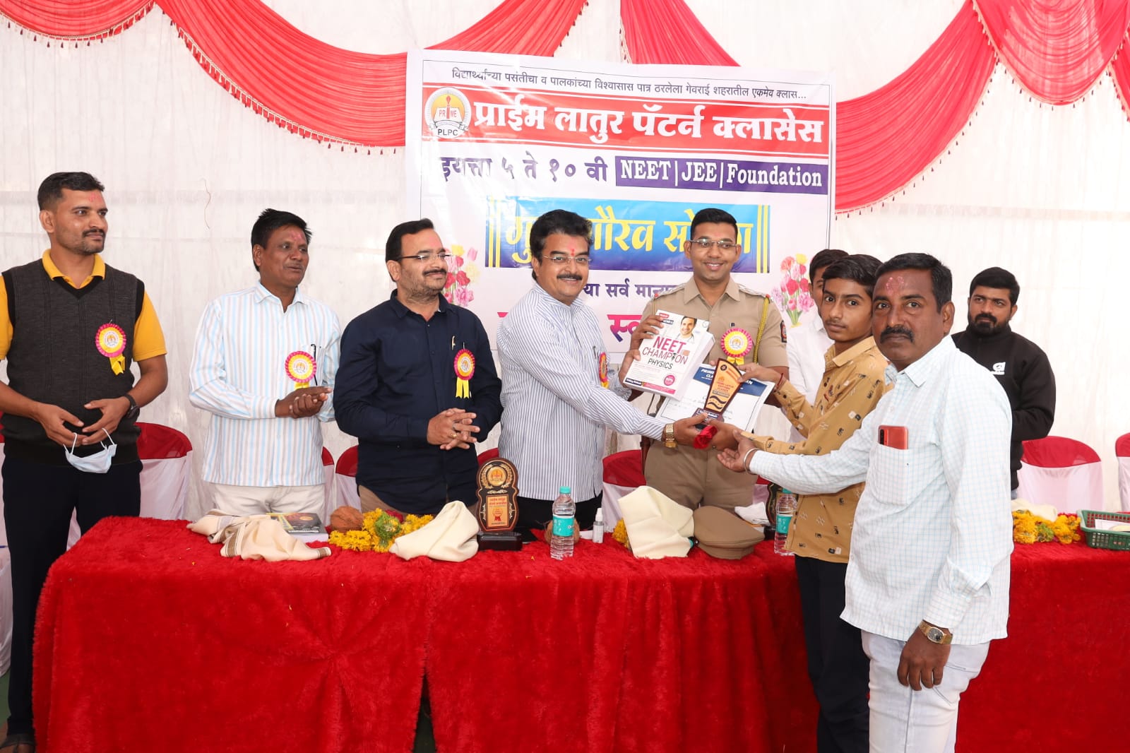 प्राईम लातूर पॅटर्न क्लासेस च्या प्रांगणात झालेल्या गौरव सोहळ्याच्या अध्यक्षस्थानी क्लासेसचे ज्येष्ठ संचालक नारायण झेंडेकर तर कलाविष्कार प्रतिष्ठानचे कार्यवाहक तथा गेवराई तालुका पत्रकार संघाचे सचिव दिनकर शिंदे, कर्तव्यदक्ष पोलीस उपनिरीक्षक संदीप काळे, युवावक्ता राहुल गिरी, शिववक्ते प्रा राजेश इंदलकर यांची प्रमुख उपस्थिती होती. कार्यक्रमाचे प्रास्ताविक क्लासेसचे संचालक सचिन पुणेकर यांनी तर शिवप्रसाद आडाळे, तुळशीदास गाडे, हरिभाऊ जाधव, प्रल्हाद खेत्रे, राहुल आतकरे यांनी उपस्थितांचे शाल, श्रीफळ व सन्मानचिन्ह देऊन स्वागत केले.