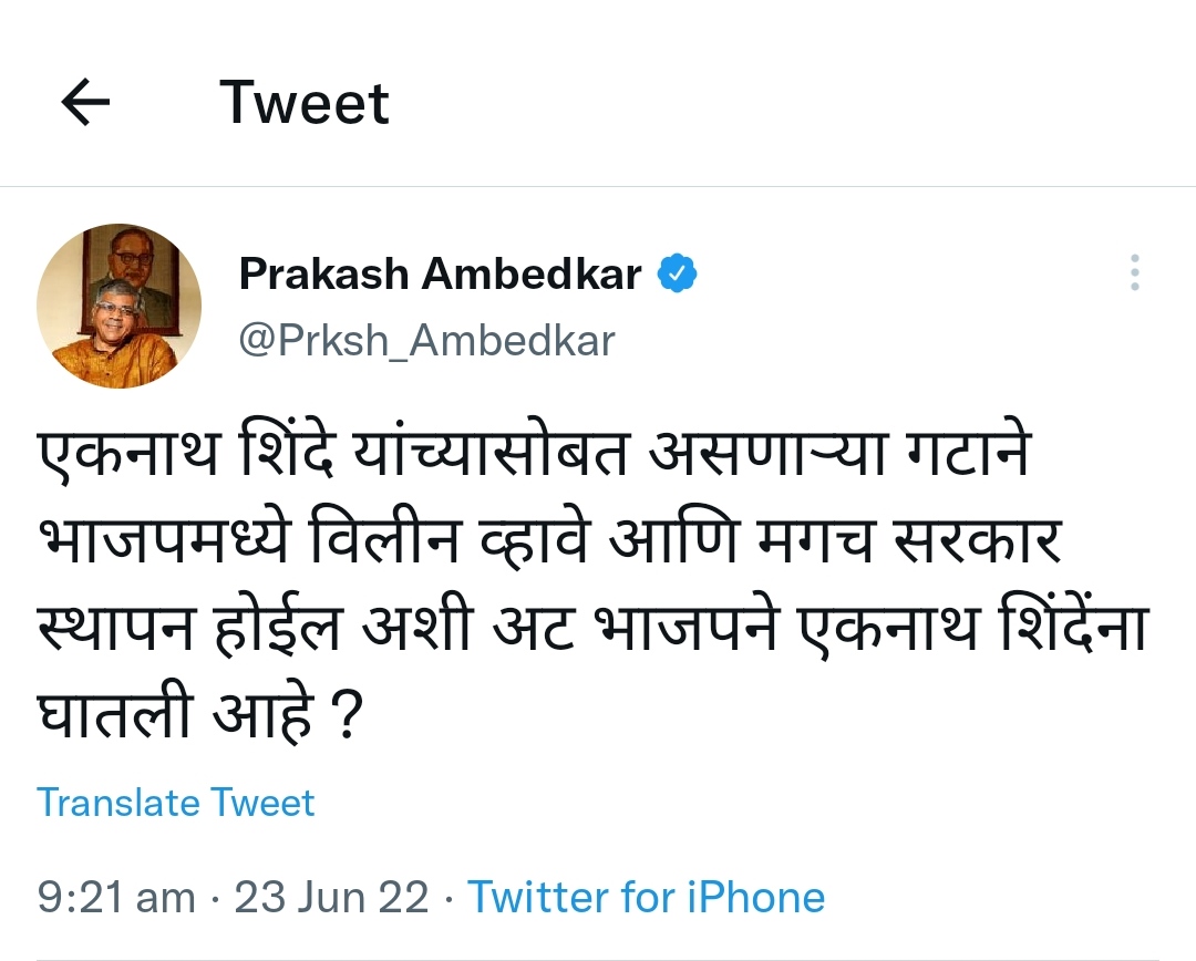 मुंबई दि २३ ( वार्ताहार ) गेल्या दोन दिवसांपासुन शिवसेना नेते यांनी शिवसेनेच्या सर्व आमदार यांना सोबत घेऊन पक्षा विरोधात व उद्धव ठाकरे यांच्या विरोधात बंड फुकारला आहे गेल्या दोन दिवसांपासुन ते गूहाठीमध्ये जाऊन बसले आहेत काल मुख्यमंत्री उद्धव ठाकरे यांनी फेसबूक लाईव्ह येऊन आपली भूमिका स्पष्ट केली व वर्षा निवस्थानावरून ते आपल्या मातोश्रीवर गेले आहेत परंतू बंडखोर एकनाथ शिंदे यांना भाजपाने काय ? ऑफर दिली यांची कुणालाच कल्पना नव्हती या सत्तासंघर्षात आत्ता वंचित आघाडीने उडी घेतली आहे या बाबद प्रकाश आंबेडकर यांनी ट्विट वरूण खुलासा केला आहे .
